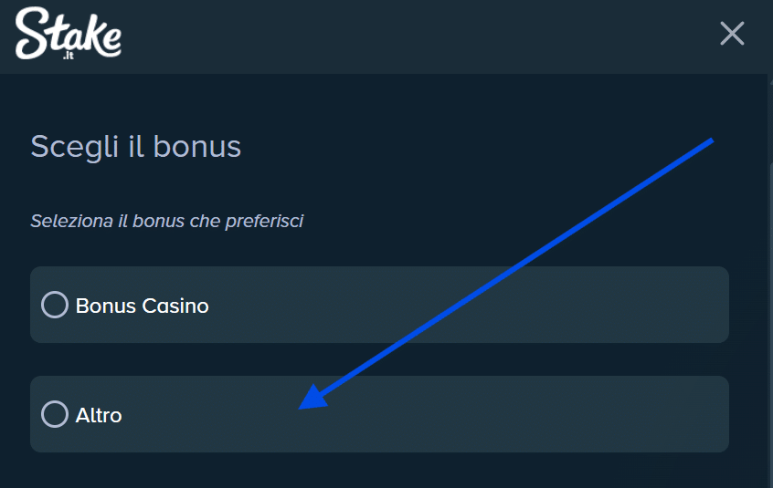 È un campo opzionale nel modulo di registrazione. Se hai ricevuto un codice promozionale Stake specifico, puoi inserirlo lì; altrimenti, ti basterà selezionare semplicemente l’offerta di benvenuto standard.